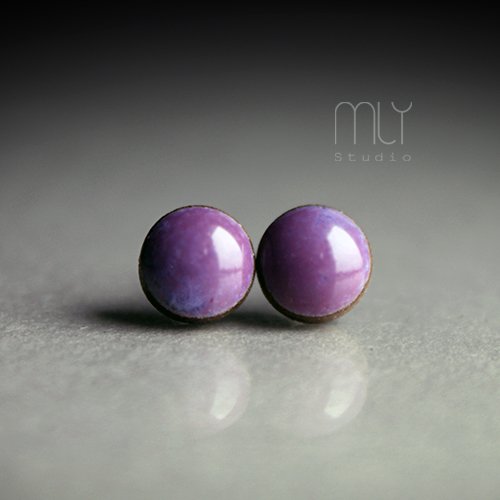 Ceramiczne okrągłe kolczyki w formie sztyftów, ręcznie wykonane z delikatnej gliny kamionkowej jednostronnie szkliwione mieszanką fioletowych z efektem plamek i pięknym połyskiem, na antyalergicznych sztyftach w kolorze srebrnym. Średnica ok. 6mm. Polecam . Termin realizacji zamówienia to 1-2 dni.