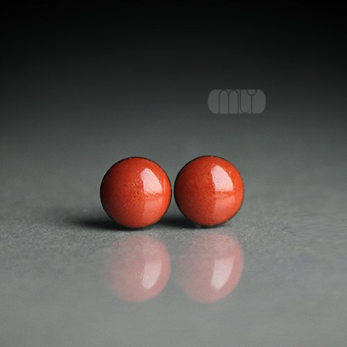 Ceramiczne okrągłe kolczyki w formie sztyftów, ręcznie wykonane z delikatnej czekoladowobrązowej gliny kamionkowej, jednostronnie szkliwione mieszanką rudo ceglastych szkliw z efektem plamek, na antyalergicznych sztyftach w kolorze srebrnym. Średnica ok.6mm. Polecam