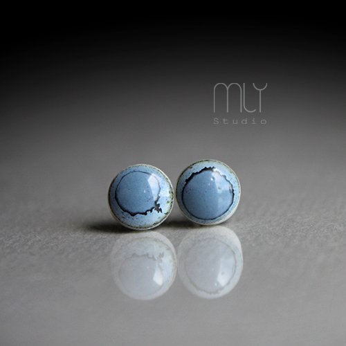 Ceramiczne, lekko nieregularne kolczyki w formie sztyftów, ręcznie wykonane z delikatnej gliny kamionkowej, jednostronnie szkliwione szarobłękitnym szkliwem z efektem plamek, na antyalergicznych sztyftach w kolorze srebrnym.Średnica ok. 6mm. Polecam