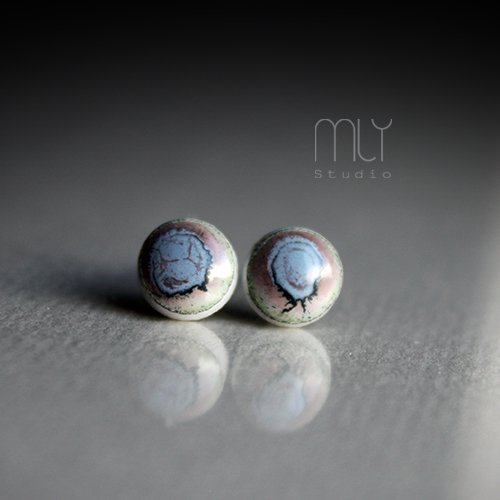 Ceramiczne, lekko nieregularne kolczyki w formie sztyftów, ręcznie wykonane z delikatnej gliny kamionkowej, jednostronnie szkliwione szarobłękitnym szkliwem z efektem plamek, na antyalergicznych sztyftach w kolorze srebrnym.Średnica ok. 6mm. Polecam