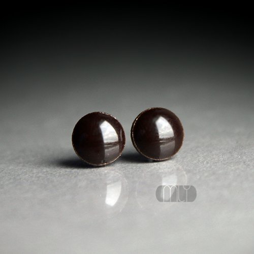 Ceramiczne okrągłe kolczyki w formie sztyftów, ręcznie wykonane z delikatnej czekoladowobrązowej gliny kamionkowej, jednostronnie szkliwione mieszanką rbrązowych szkliw z efektem plamek, na antyalergicznych sztyftach w kolorze srebrnym. Średnica ok.6mm. Polecam