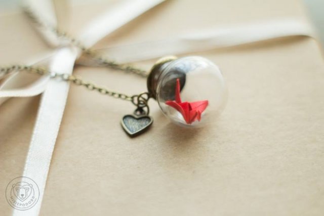 Delikatny, maleńki, papierowy żuraw - japoński symbol szczęścia, zdrowia i pokoju. Podobno, jeśli w jakiejś intencji złoży się tysiąc żurawich figurek, to życzenie się spełni. My spełniamy życzenia tym zjawiskowym wisiorkiem. Papierowy żuraw ukryty w szklanej kuleczce o najszerszej średnicy 2 cm. Część ozdobna zawieszona na łańcuszku o długości 36 cm. Całość w kolorze starego złota/brązu.