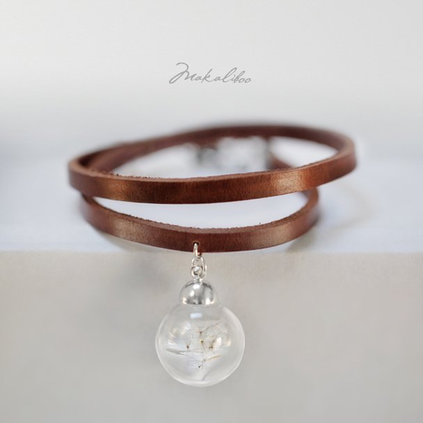 Niezwykle delikatna, kobieca bransoletka z nasionami dmuchawca zamkniętymi swobodnie w szklanej kuli. Każdy egzemplarz jest niepowtarzalny. Nasionka zostały specjalnie spreparowane i nie zmienią swojego wyglądu podczas noszenia. Zawieszka ma średnicę 16 mm. Bransoletka wykonana jest z naturalnej skóry, szerokość paseczka 5 mm, zapięcie w kolorze srebra. Pasuje na nadgarstek 14,5 - 15 , 5 cm. (potrzebujesz inny rozmiar - napisz)
