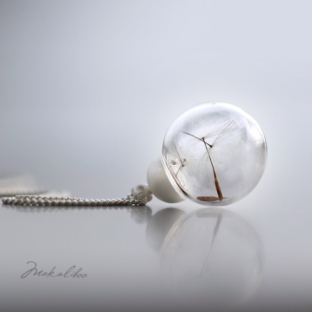 Niezwykle, delikatny, elegancki, kobiecy naszyjnik z nasionami dmuchawca zamkniętymi swobodnie w szklanej kuli. Każdy egzemplarz jest niepowtarzalny. Nasionka zostały specjalnie spreparowane i nie zmienią swojego wyglądu podczas noszenia. Naszyjnik ma średnicę 16 mm. Długość łańcuszka 45 cm. Baza w kolorze srebrnym. Dmuchawiec jest symbolem inteligencji, otwartego umysłu, siły przetrwania, czystości, szczęścia. Ofiarowany przez kogoś - uznawany jest za symbol absolutnej wierności i początku czegoś nowego. Projekt autorski. Wszystkie prawa zastrzeżone.