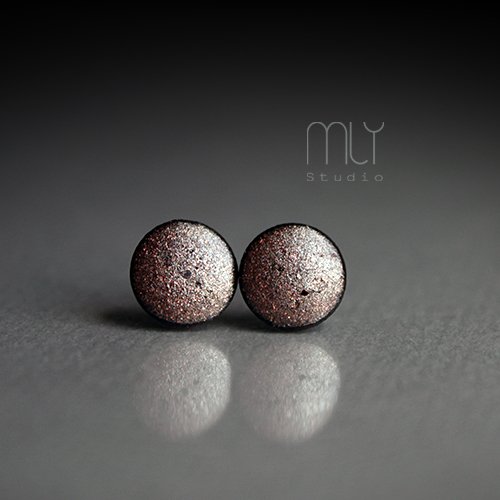 Ceramiczne, lekko nieregularne kolczyki w formie sztyftów, ręcznie wykonane z delikatnej gliny kamionkowej, jednostronnie szkliwione efektownym brązowym subtelnie błyszczącym szkliwem z efektem plamek i połyskujących drobinek, na antyalergicznych sztyftach w kolorze srebrnym.Średnica ok. 6mm. Polecam