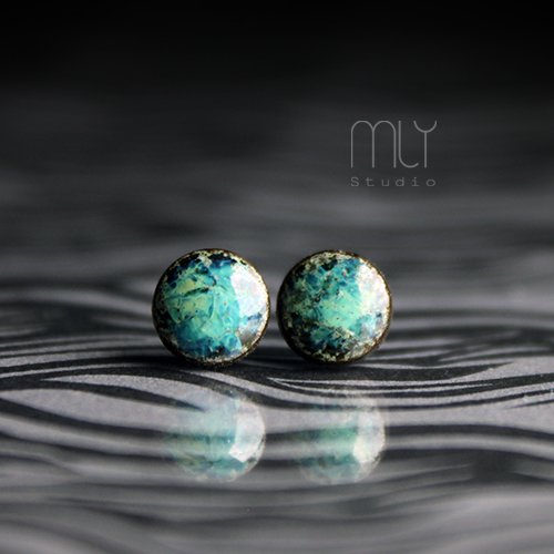 Ceramiczne okrągłe kolczyki w formie sztyftów, ręcznie wykonane z delikatnej gliny kamionkowej, jednostronnie szkliwione mieszanką błyszczących błękitnozielonych szkliw z efektem plamek i drobinek, na sztyftach w kolorze srebrnym. Średnica ok.6mm. Polecam