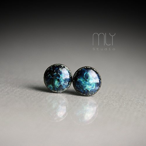 Ceramiczne okrągłe kolczyki w formie sztyftów, ręcznie wykonane z delikatnej gliny kamionkowej, jednostronnie szkliwione mieszanką błyszczących błękitnozielonych szkliw z efektem plamek i drobinek, na sztyftach w kolorze srebrnym. Średnica ok.6mm. Polecam