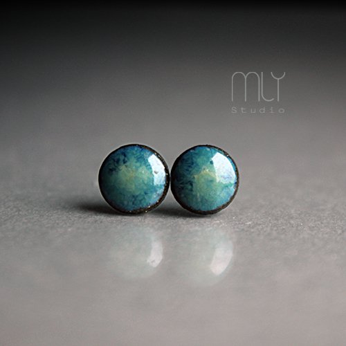 Ceramiczne okrągłe kolczyki w formie sztyftów, ręcznie wykonane z delikatnej gliny kamionkowej, jednostronnie szkliwione mieszanką błyszczących błękitnozielonych szkliw z efektem plamek i drobinek, na sztyftach w kolorze srebrnym. Średnica ok.6mm. Polecam
