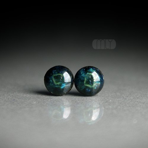 Ceramiczne okrągłe kolczyki w formie sztyftów, ręcznie wykonane z delikatnej gliny kamionkowej, jednostronnie szkliwione mieszanką błyszczących błękitnozielonych szkliw z efektem plamek i drobinek, na sztyftach w kolorze srebrnym. Średnica ok.6mm. Polecam
