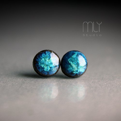 Ceramiczne okrągłe kolczyki w formie sztyftów, ręcznie wykonane z delikatnej gliny kamionkowej, jednostronnie szkliwione mieszanką błyszczących błękitnozielonych szkliw z efektem plamek i drobinek, na sztyftach w kolorze srebrnym. Średnica ok.6mm. Polecam