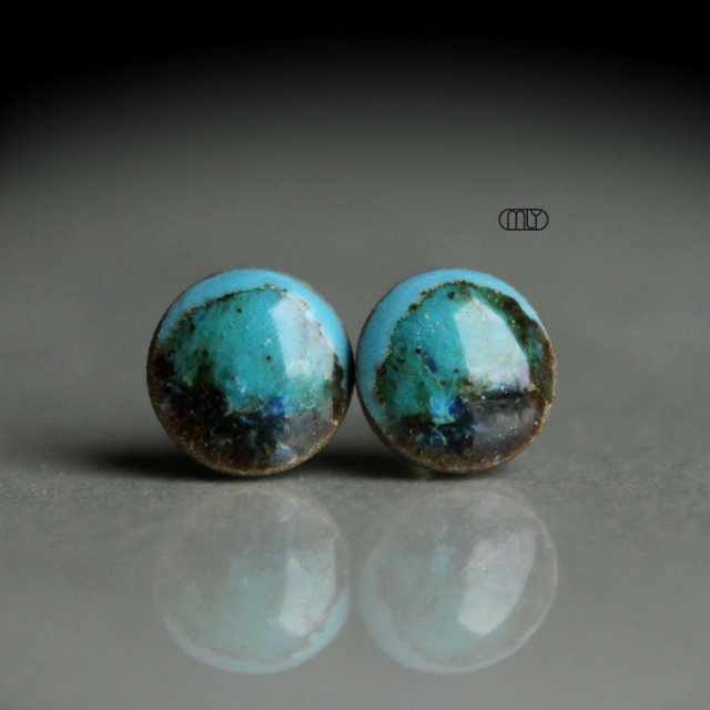 Ceramiczne okrągłe kolczyki w formie sztyftów, ręcznie wykonane z delikatnej gliny kamionkowej, jednostronnie szkliwione mieszanką błyszczących błękitnozielonych szkliw z efektem plamek i drobinek, na sztyftach w kolorze srebrnym. Średnica ok.6mm. Polecam