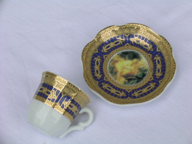 Duet filiżaneczki ze spodkiem w bardzo bogatej, eleganckiej odsłonie. Złoto, królewska niebieskość i tajemniczej, świetlistej Gracji obecność na spodkowym medalionie :) Ryflowanie klasycznej formy. Do kolekcji, ozdoby, na prezent i ku uciesze. Spodek 7,5 x 1,5; Filiżanka 5 x 4 cm. Nie sygnowane. Stan zachowania bardzo dobry.