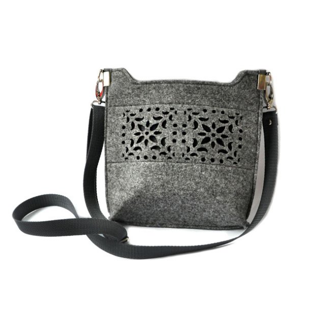 Mała, ciekawa torebka na pasku z regulacją długości. Zaprojektowana i uszyta z szarego, grubego i sztywnego filcu jednostronnie impregnowanego. Na przodzie torby drobny ażur przez który prześwituje grafitowy filc. Wewnątrz mała kieszeń na nap. Torebka zamykana na zamek. Całość jest sztywna. Wymiary torby: wysokość mierzona przez środek torebki 21cm, szerokość 22cm, głębokość dna 4cm. Długość paska max 110cm. Jest bardzo wygodna. Części torebki wycięte laserowo.