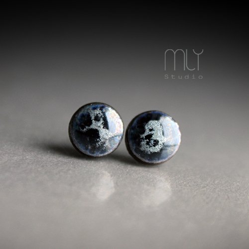 Ceramiczne kolczyki w formie sztyftów, ręcznie wykonane z delikatnej gliny kamionkowej, jednostronnie szkliwione granatowo srebrzystym szkliwem z efektem plamek, na antyalergicznych sztyftach w kolorze srebrnym. Średnica ok. 6mm.Polecam