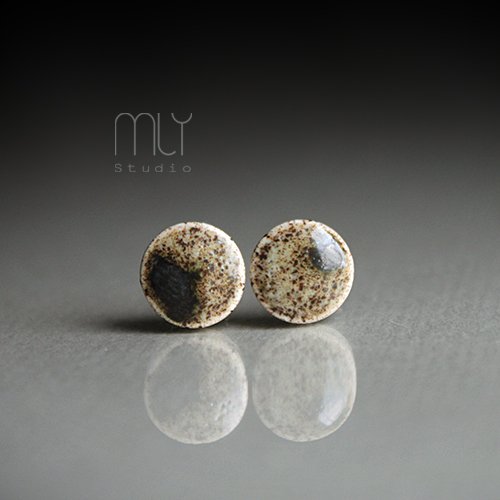 Ceramiczne okrągłe kolczyki w formie sztyftów, ręcznie wykonane z delikatnej czekoladowobrązowej gliny kamionkowej, jednostronnie szkliwione mieszanką szarobrązowych szkliw z efektem plamek, na antyalergicznych sztyftach w kolorze srebrnym. Średnica ok. 6mm. Polecam