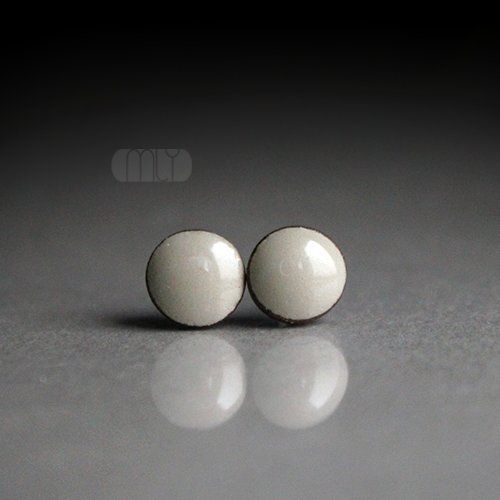 Ceramiczne okrągłe kolczyki w formie sztyftów, ręcznie wykonane z delikatnej czekoladowobrązowej gliny kamionkowej, jednostronnie szkliwione mieszanką szarych szkliw z efektem plamek, na antyalergicznych sztyftach w kolorze srebrnym. Średnica ok. 6mm. Polecam