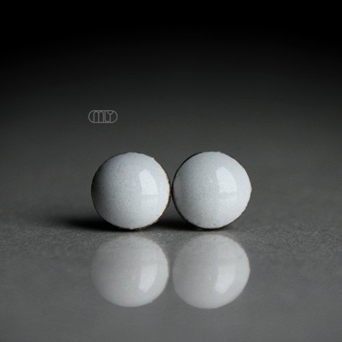Ceramiczne okrągłe kolczyki w formie sztyftów, ręcznie wykonane z delikatnej czekoladowobrązowej gliny kamionkowej, jednostronnie szkliwione mieszanką szarych szkliw z efektem plamek, na antyalergicznych sztyftach w kolorze srebrnym. Średnica ok. 6mm. Polecam