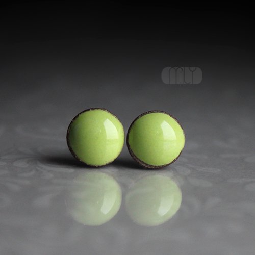 Ceramiczne okrągłe kolczyki w formie sztyftów, ręcznie wykonane z delikatnej gliny kamionkowej jednostronnie szkliwione zielonym szkliwem z efektem plamek i pięknym połyskiem, na antyalergicznych sztyftach w kolorze srebrnym. Średnica ok. 6mm. Polecam . Termin realizacji zamówienia to 1-2 dni.