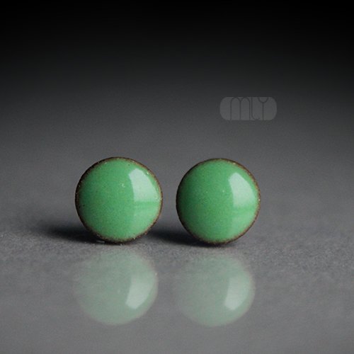 Ceramiczne okrągłe kolczyki w formie sztyftów, ręcznie wykonane z delikatnej gliny kamionkowej jednostronnie szkliwione zielonym szkliwem z efektem plamek i pięknym połyskiem, na antyalergicznych sztyftach w kolorze srebrnym. Średnica ok. 6mm. Polecam . Termin realizacji zamówienia to 1-2 dni.