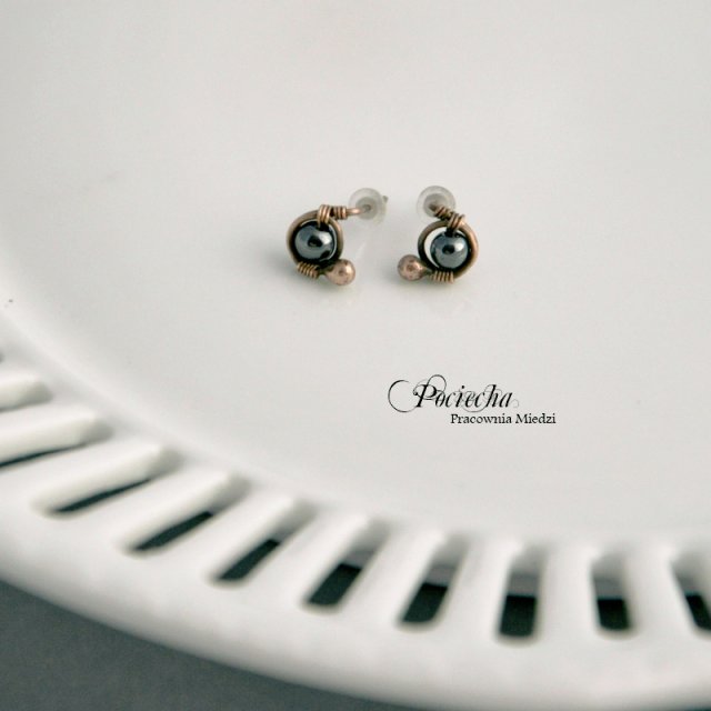 Śliczne kolczyki sztyfty. Kolczyki ozdobione kuleczkami hematytu. Kamyki mają średnicę 4 mm. Wkrętki mają wymiary 0,9 x 0,7 cm. Baranki silikonowe.