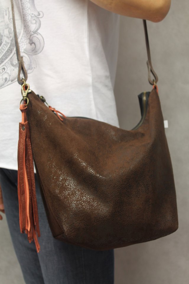 Mała, poręczna torebka wykonana z alkanatary o ciekawej fakturze, czekoladowej skóry juchtowej ( regulowany pasek). Wewnątrz znajduję się mała kieszonka, cała torebka zapina się na zamek. Dodatkową ozdobą są skórzane frędzle. Wymiary: ok.26x35cm