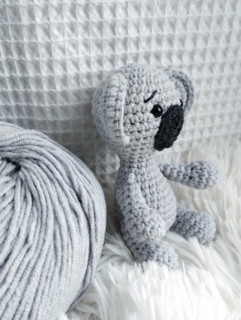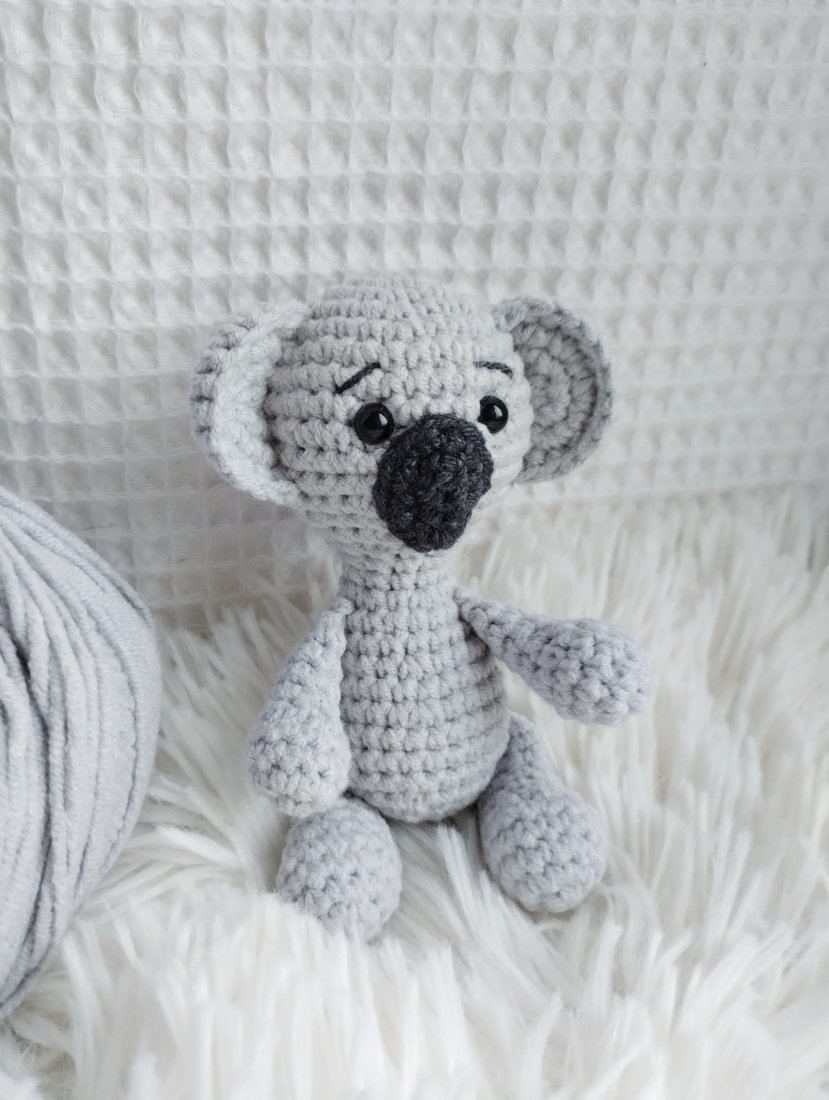 A zabawka to mini koala. Mini, bo pochodzi z serii namniejszych dzierganych przeze mnie zabawek. Ma ok 11 cm wzrostu, wielgaśne uszy i nosek - jak na koalę przystało. Będzie doskonałym towarzyszem każdej zabawy, a biorąc pod uwagę jego kieszonkowy rozmiar będzie mógł wyruszyć na każdą wyprawę!
