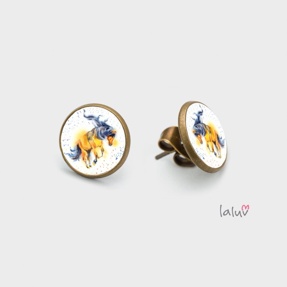 Ręcznie robione kolczyki z wysokiej jakości grafiką zamkniętą pod wypukłym szkiełkiem i oprawioną w antyalergiczną bazę w kolorze antycznego złota. Każda para zaopatrzona jest w zatyczki w kolorze bazy zapobiegające wypadaniu kolczyków z uszu. ;)