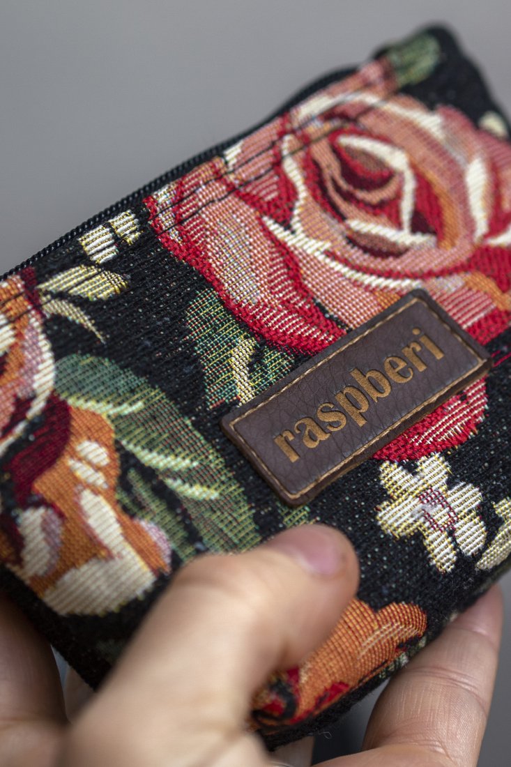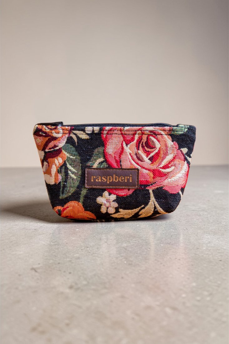 Kosmetyczka w rozmiarze MINI wykonana z czarnego żakardu w kwiaty.