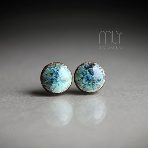 Ceramiczne okrągłe kolczyki w formie sztyftów, ręcznie wykonane z delikatnej gliny kamionkowej, jednostronnie szkliwione mieszanką zielonego szkliwa z lekką nutką błękitu, na antyalergicznych sztyftach w kolorze srebrnym.Średnica ok. 6mm.. Polecam