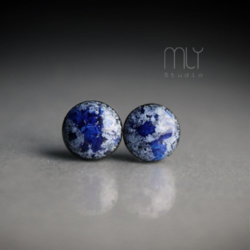 Ceramiczne lekko nieregularne kolczyki w formie sztyftów, ręcznie wykonane z delikatnej gliny kamionkowej, jednostronnie szkliwione kobaltowo błękitnym szkliwem z efektem drobnych plamek i krystalizacji, na antyalergicznych sztyftach w kolorze srebrnym.Średnica ok. 6mm. Polecam