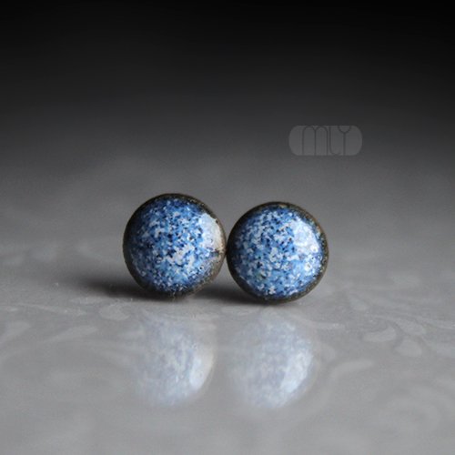 Ceramiczne okrągłe kolczyki w formie sztyftów, ręcznie wykonane z delikatnej gliny kamionkowej jednostronnie szkliwione szarobłękitnym szkliwem z efektem plamek, na antyalergicznych sztyftach w kolorze srebrnym. Średnica ok. 6mm. Polecam . Termin realizacji zamówienia to 1-2 dni.