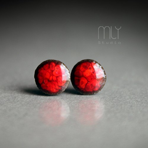 Okrągłe, lekko nieregularne ceramiczne kolczyki w formie sztyftów, ręcznie wykonane z delikatnej gliny kamionkowej, jednostronnie szkliwione intensywnym czerwonym szkliwem z efektem plamek i pięknym połyskiem, na sztyftach w kolorze srebrnym. Średnica ok. 6mm.Polecam