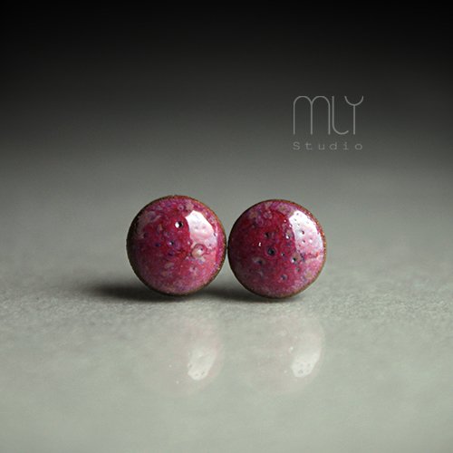 Ceramiczne okrągłe kolczyki w formie sztyftów, ręcznie wykonane z delikatnej gliny kamionkowej jednostronnie szkliwione mieszanką ciemnioróżowych z efektem plamek i pięknym połyskiem, na antyalergicznych sztyftach w kolorze srebrnym. Średnica ok. 6mm. Polecam . Termin realizacji zamówienia to 1-2 dni.