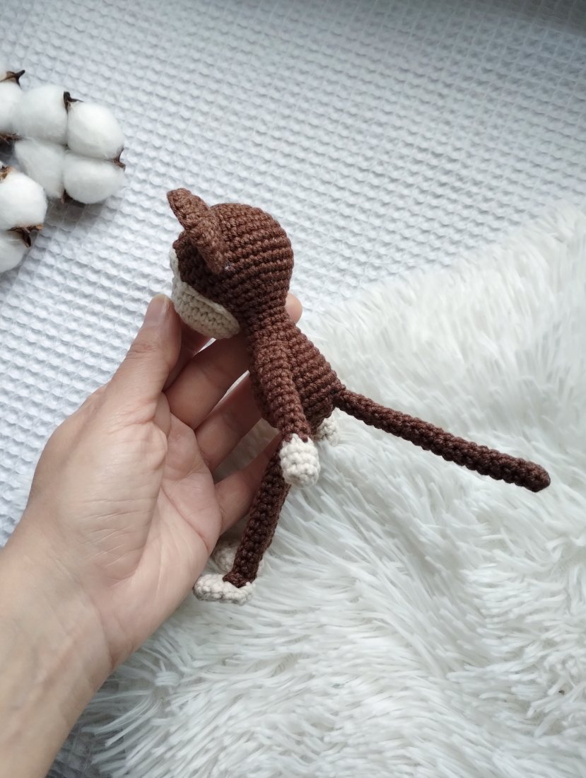 A zabawka to mini małpka. Mini, bo pochodzi z serii namniejszych dzierganych przeze mnie zabawek. Ma ok 17 cm wzrostu, wielgaśne uszy i długi ogonek - jak na małpkę przystało. Będzie doskonałą towarzyszką każdej zabawy, a biorąc pod uwagę jej kieszonkowy rozmiar będzie mogła wyruszyć na każdą wyprawę!