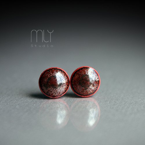 Ceramiczne lekko nieregularne kolczyki w formie sztyftów, ręcznie wykonane z delikatnej porcelany, barwionej na koralową czerwień jednostronnie szkliwione czerwono brązowym szkliwem z efektem drobnych plamek, na antyalergicznych sztyftach w kolorze srebrnym.Średnica ok.6mm. Polecam
