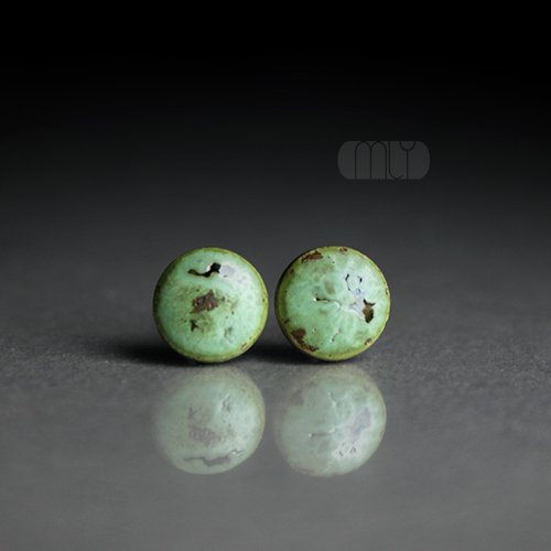 Ceramiczne okrągłe kolczyki w formie sztyftów, ręcznie wykonane z delikatnej czekoladowobrązowej gliny kamionkowej, jednostronnie szkliwione mieszanką zielonych szkliw z efektem plamek, na antyalergicznych sztyftach w kolorze srebrnym. Średnica ok.6mm. Polecam