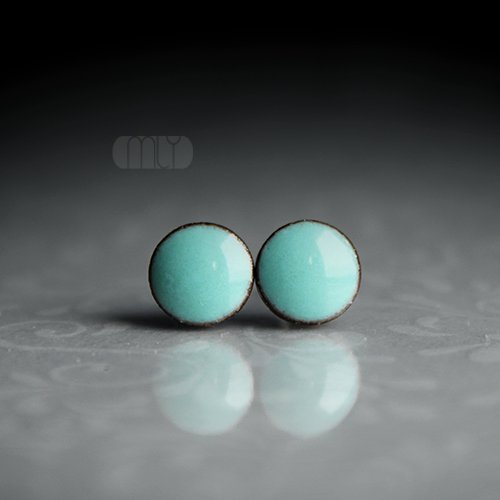 Okrągłe, lekko nieregularne ceramiczne kolczyki w formie sztyftów, ręcznie wykonane z delikatnej gliny kamionkowej, jednostronnie szkliwione turkusowo zielonym szkliwem z efektem plamek i subtelnym połyskiem, na sztyftach w kolorze srebrnym. Średnica ok. 6mm.Polecam