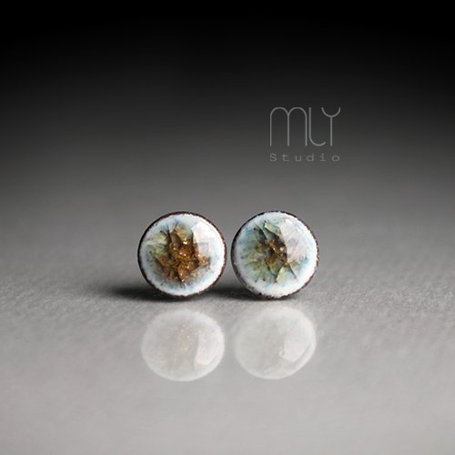 Ceramiczne, lekko nieregularne kolczyki w formie sztyftów, ręcznie wykonane z delikatnej gliny kamionkowej, jednostronnie szkliwione efektownym kremowo brązowym szkliwem z efektem spękań i pięknym połyskiem, na antyalergicznych sztyftach w kolorze srebrnym.Średnica ok. 6mm. Polecam