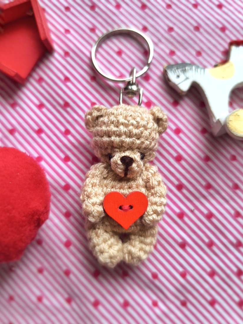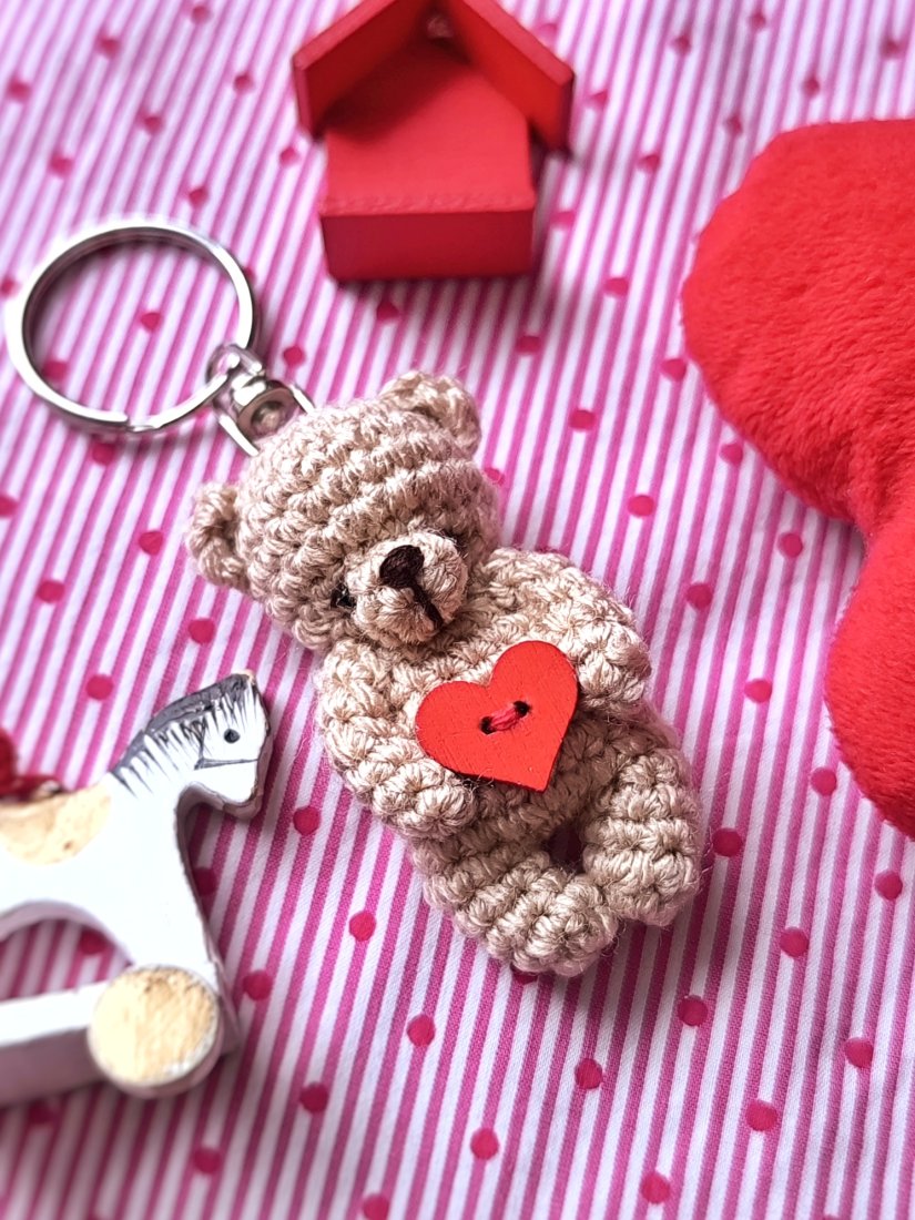NOWOŚĆ - miniaturowy miś breloczek. Mierzy około 5 cm plus elementy metalowe ok 3,5 cm. Wykonany z beżowej włóczki akrylowej. Wypełniony antyalergiczną kulką silikonową. Miś został udekorowany drewnianym guzikiem pomalowanym na czerwono w kształcie serca.