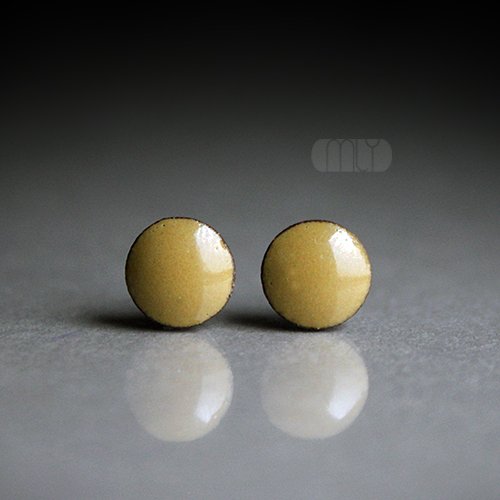 Okrągłe, lekko nieregularne ceramiczne kolczyki w formie sztyftów, ręcznie wykonane z delikatnej gliny kamionkowej, jednostronnie szkliwione zielonkawo brązowym szkliwem z efektem plamek i pięknym połyskiem, na sztyftach w kolorze srebrnym. Średnica ok. 6mm.Polecam
