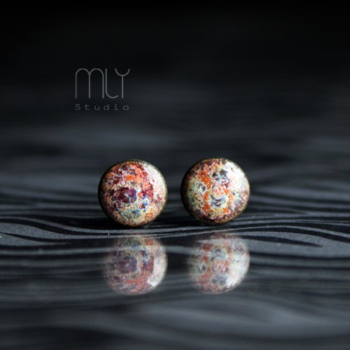 Ceramiczne okrągłe kolczyki w formie sztyftów, ręcznie wykonane z delikatnej gliny kamionkowej, jednostronnie szkliwione mieszanką różowo beżowo czerwonych szkliw z efektem plamek i pięknym połyskiem, na antyalergicznych sztyftach w kolorze srebrnym.Średnica ok. 6mm.. Polecam