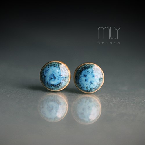 Ceramiczne lekko nieregularne kolczyki w formie sztyftów, ręcznie wykonane z delikatnej gliny kamionkowej, jednostronnie szkliwione błękitnym szkliwem z efektem drobnych plamek na antyalergicznych sztyftach w kolorze srebrnym.Średnica ok. 6mm. Polecam