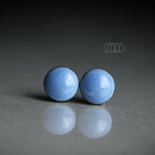 Ceramiczne okrągłe kolczyki w formie sztyftów, ręcznie wykonane z delikatnej gliny kamionkowej jednostronnie szkliwione mieszanką błękitnych szkliw z efektem plamek, na antyalergicznych sztyftach w kolorze srebrnym. Średnica ok. 6mm. Polecam . Termin realizacji zamówienia to 1-2 dni.