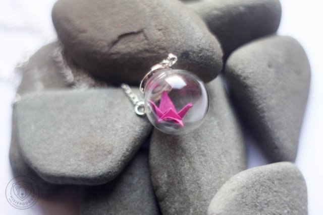 Delikatny, maleńki, papierowy żuraw - japoński symbol szczęścia, zdrowia i pokoju. Podobno, jeśli w jakiejś intencji złoży się tysiąc żurawich figurek, to życzenie się spełni. My spełniamy życzenia tym zjawiskowym wisiorkiem. Papierowy żuraw ukryty w szklanej kuleczce o najszerszej średnicy 2 cm. Część ozdobna zawieszona na łańcuszku o długości 36 cm. Całość w kolorze srebra.