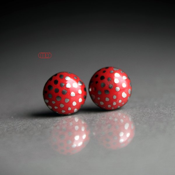 Ceramiczne okrągłe kolczyki w formie sztyftów, ręcznie wykonane z delikatnej gliny kamionkowej jednostronnie szkliwione srebrno czerwonym szkliwem z efektem plamek i pięknym połyskiem, na antyalergicznych sztyftach w kolorze srebrnym. Średnica ok. 6mm. Polecam . Termin realizacji zamówienia to 1-2 dni.
