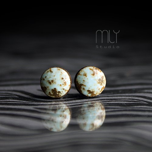 Ceramiczne okrągłe kolczyki w formie sztyftów, ręcznie wykonane z delikatnej gliny kamionkowej jednostronnie szkliwione błękitnym szkliwem z efektem plamek, na antyalergicznych sztyftach w kolorze srebrnym. Średnica ok. 6mm. Polecam . Termin realizacji zamówienia to 1-2 dni.