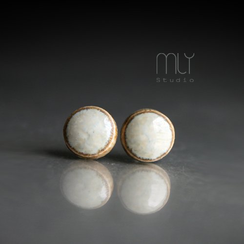 Ceramiczne okrągłe kolczyki w formie sztyftów, ręcznie wykonane z delikatnej jasnobeżowej gliny kamionkowej, jednostronnie szkliwione subtelnym beżowym szkliwem z efektem brązowych plamek, na antyalergicznych sztyftach w kolorze srebrnym. Średnica ok.6mm. Polecam