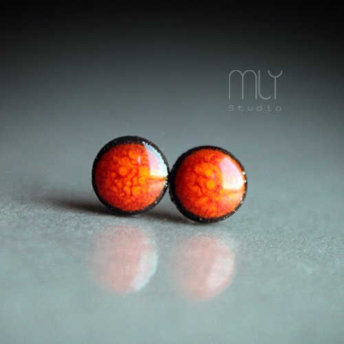 Okrągłe, lekko nieregularne ceramiczne kolczyki w formie sztyftów, ręcznie wykonane z delikatnej gliny kamionkowej, jednostronnie szkliwione intensywnym pomarańczowym szkliwem z efektem plamek i pięknym połyskiem, na sztyftach w kolorze srebrnym. Średnica ok. 6mm.Polecam