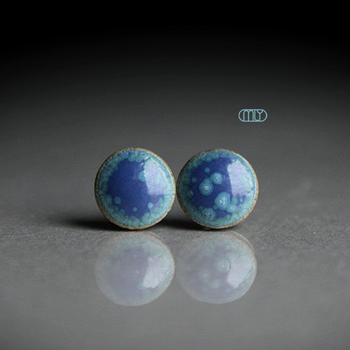 Ceramiczne, lekko nieregularne kolczyki w formie sztyftów, ręcznie wykonane z delikatnej czekoladowobrązowej gliny kamionkowej, jednostronnie szkliwione efektownym błękitnozielonym błyszczącym szkliwem z efektem plamek, na antyalergicznych sztyftach w kolorze srebrnym.Średnica ok 6mm. Polecam
