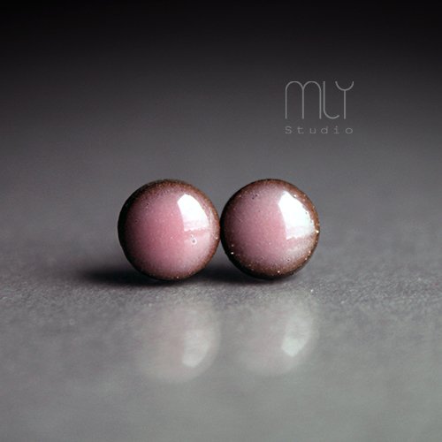 Ceramiczne okrągłe kolczyki w formie sztyftów, ręcznie wykonane z delikatnej gliny kamionkowej jednostronnie szkliwione mieszanką różowych z efektem plamek i pięknym połyskiem, na antyalergicznych sztyftach w kolorze srebrnym. Średnica ok. 6mm. Polecam . Termin realizacji zamówienia to 1-2 dni.